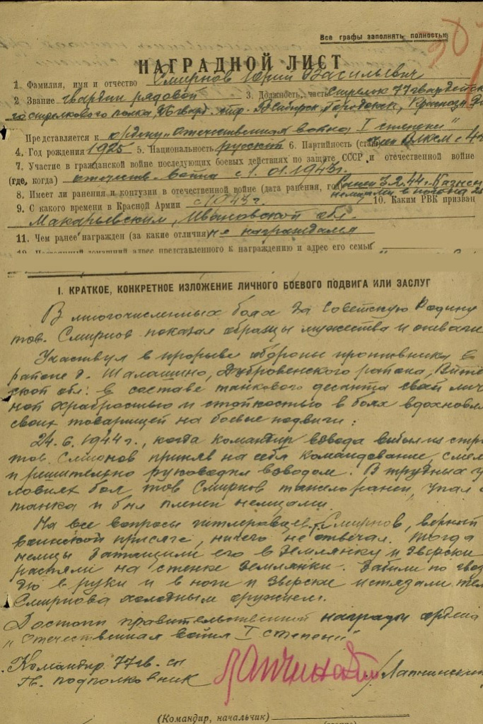 Юра Смирнов был третьим ребенком в семье. Рос отзывчивым, добрым парнем, хотя и набедокурить мог, как вспоминала мама. Но, несмотря на упрямство, умел признать вину за собой. «Любил лес, речку, лошадей. Дружил с ребятами», — писала Мария Федоровна в послании солдатам Красной армии. После шестого класса, в 1941 году, Юра поступил в Макарьевскую школу фабрично-заводского обучения на электросварщика. Эти и другие подробности биографии героя мы узнали в ответном письме, которое пришло в адрес «СГ» на запрос из Нижнего Новгорода.